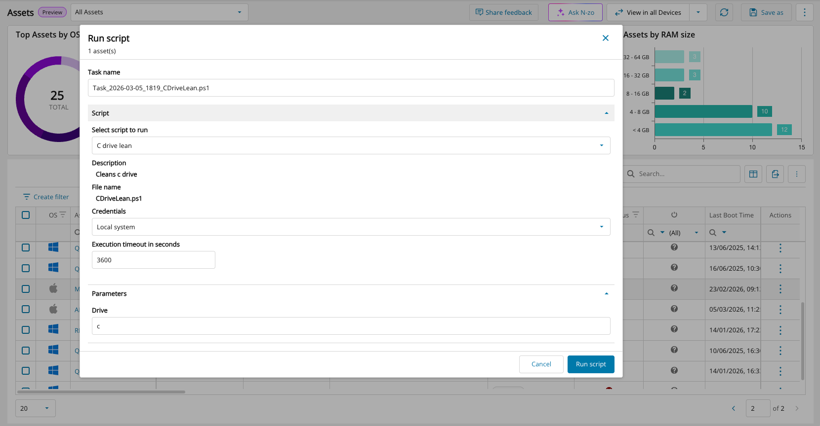 Run Script: Execute scripts on demand for individual Windows, macOS, and Linux devices directly from the Assets view.