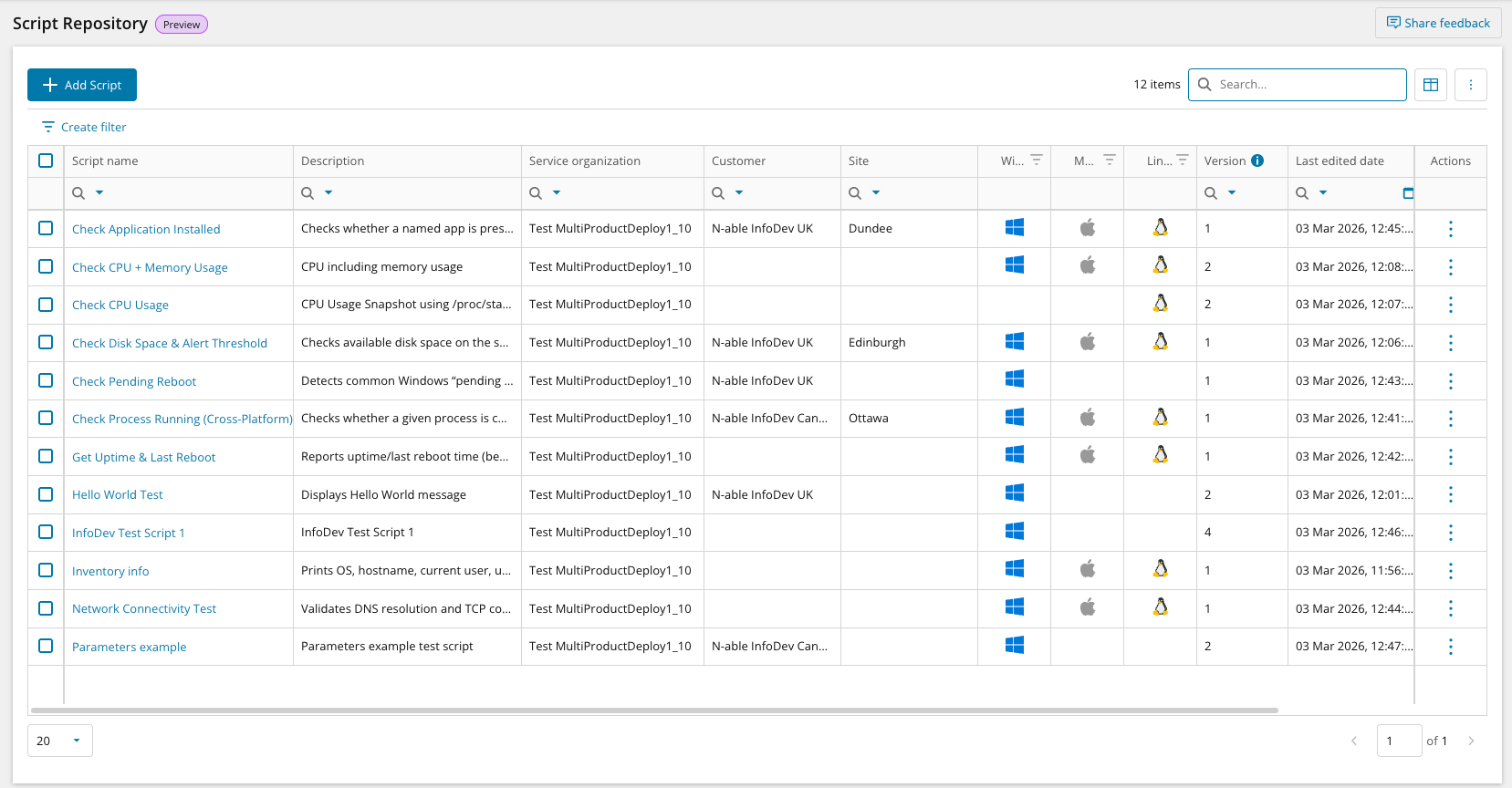 Script categorization by Type and Operating System, with assignment to Service Organizations, Customers, or Sites.