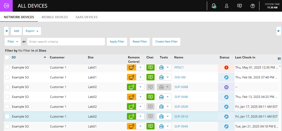 Remote Control, Two-Way Chat, and Tools buttons in All Devices, Active Issues, Dashboards, and the Device Header now use the new button styling.