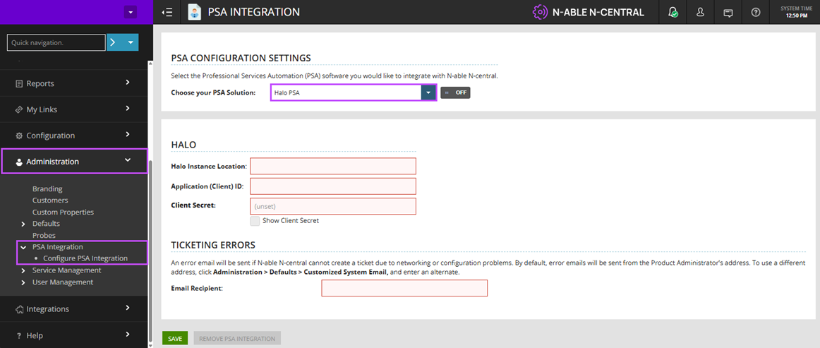 After you integrate with HaloPSA additional options appear under PSA Integration in the N-central navigation pane:
