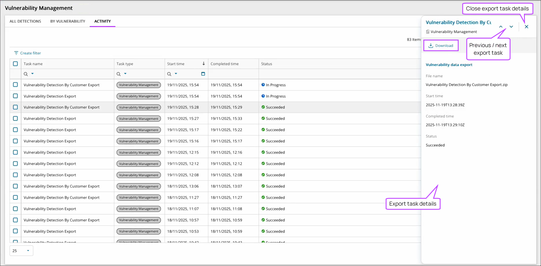 - Activity details the in progress and historical large exports (10k+ rows) statuses.