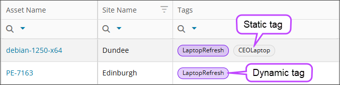 - Automatic assignment: The system assigns dynamic tags based on filter rules and asset properties. Tags adjust as asset properties change.