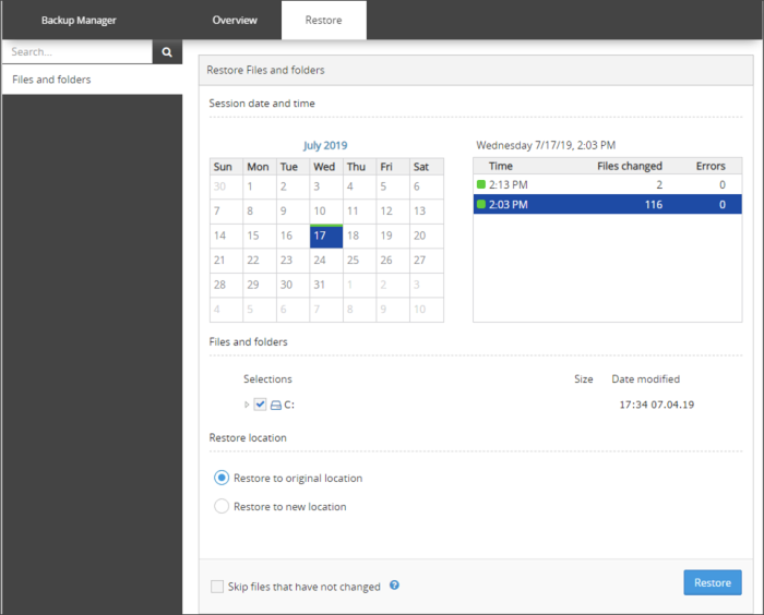 - Select Skip files that have not changed if you wish to only restore files which have been modified between the date of backup and the date of restore