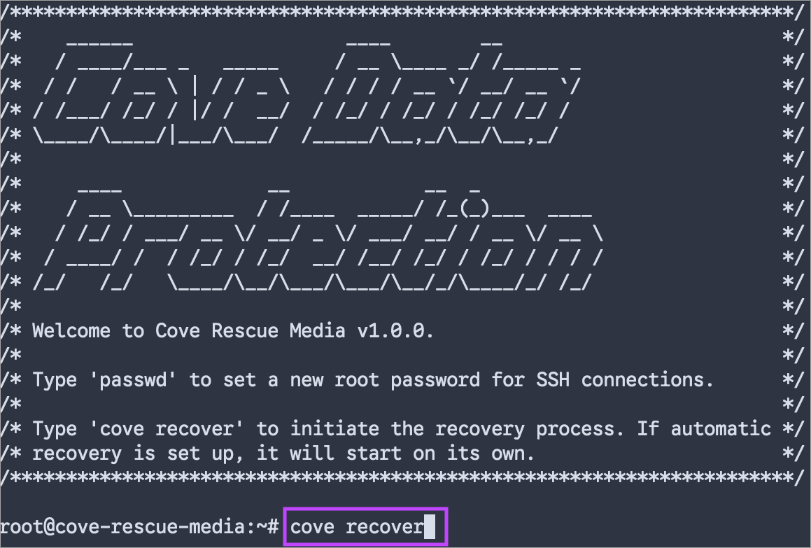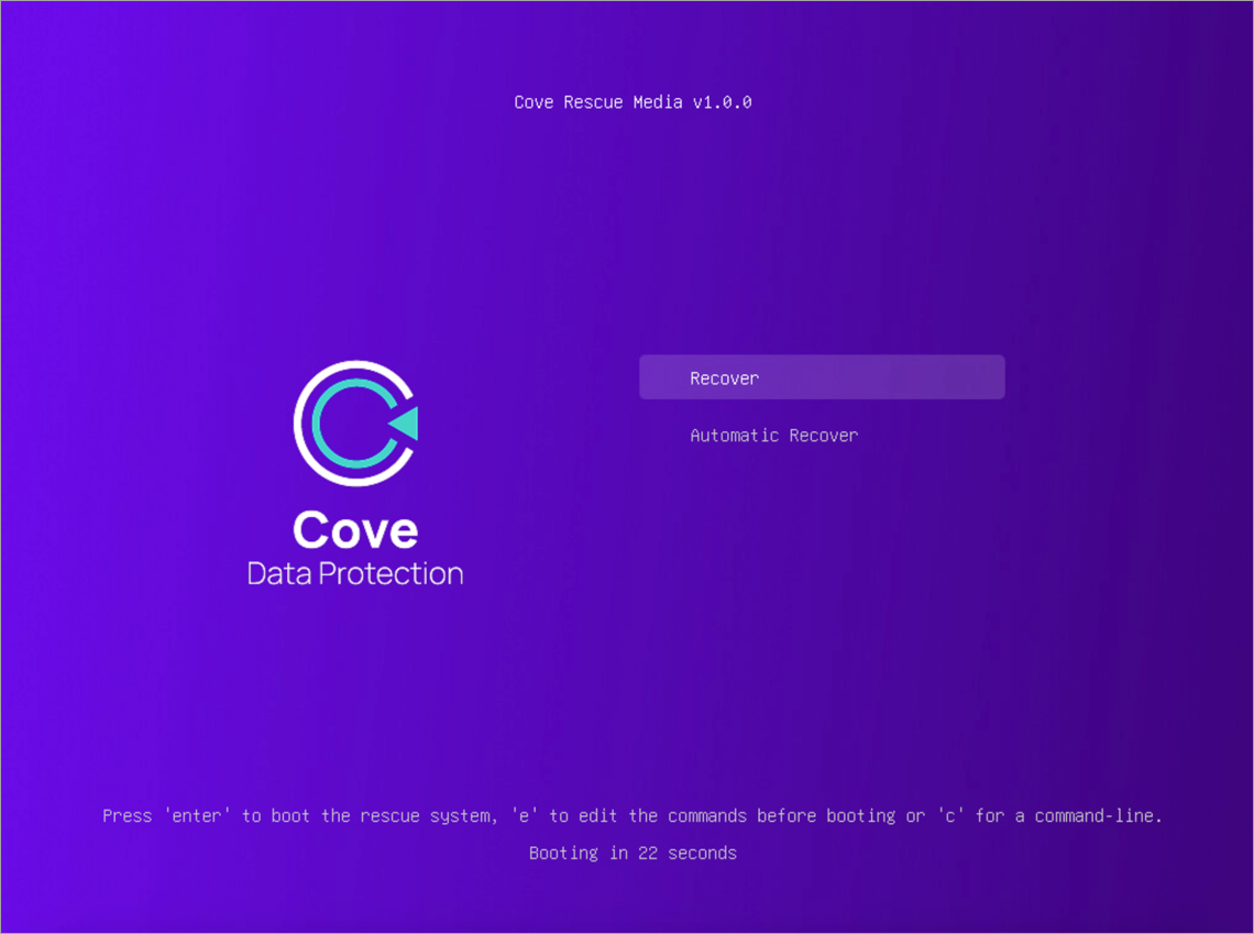 Once the device is started from the rescue ISO, Cove Rescue Media boot menu appears: