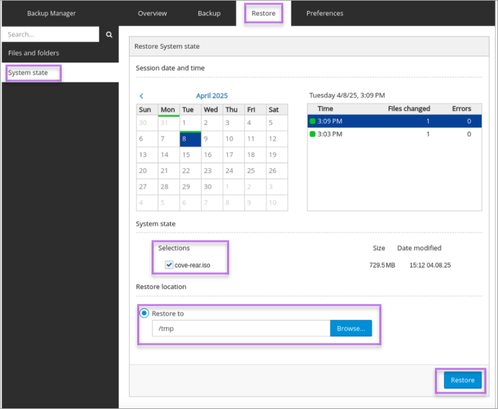 Under the Restore tab, select a specific System state backup session, cove-rear.iso, and the restore location where the cove-rear.iso file will be restored
