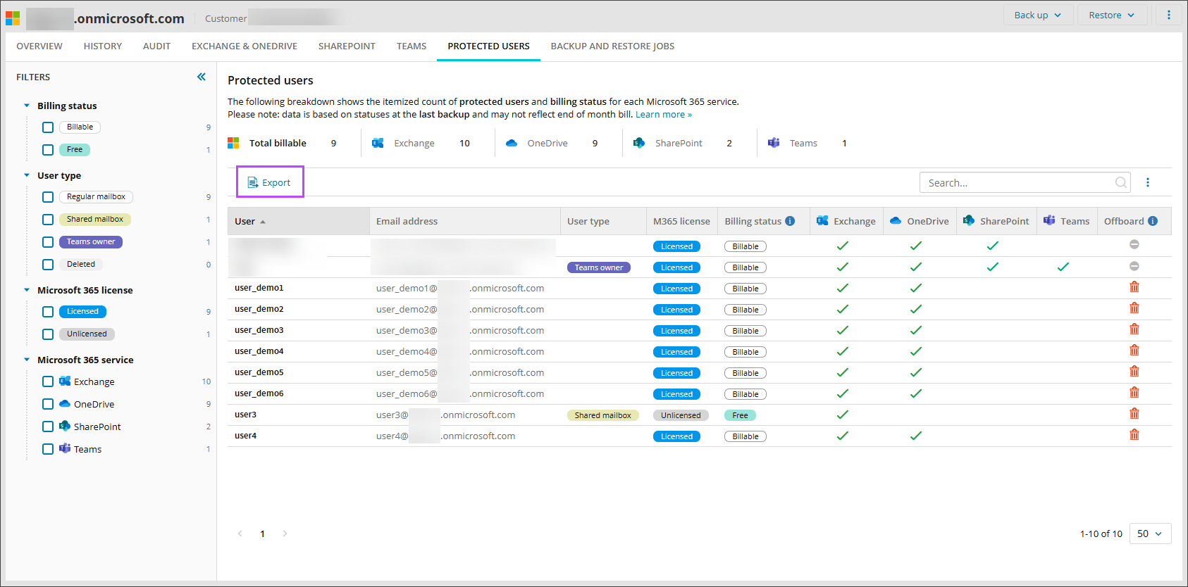 On the Protected users tab, you can view a full list of all users for whom at least one data source (service) is backed up, how many of these users are billable and the services protected for these users.