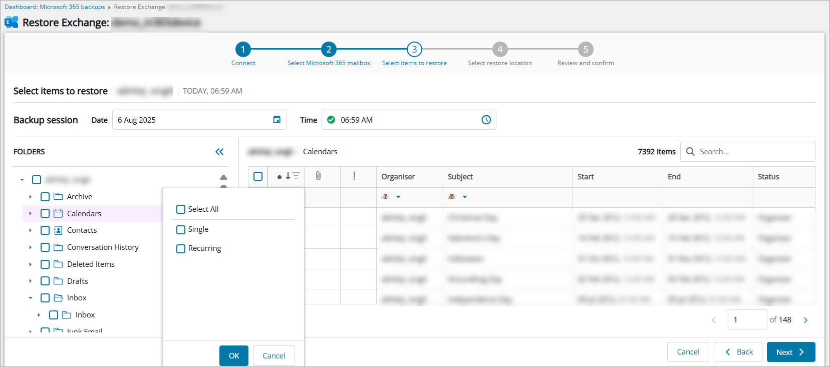 Microsoft may resend calendar event notifications when restoring a full mailbox. To avoid this, deselect calendar items before restoring.