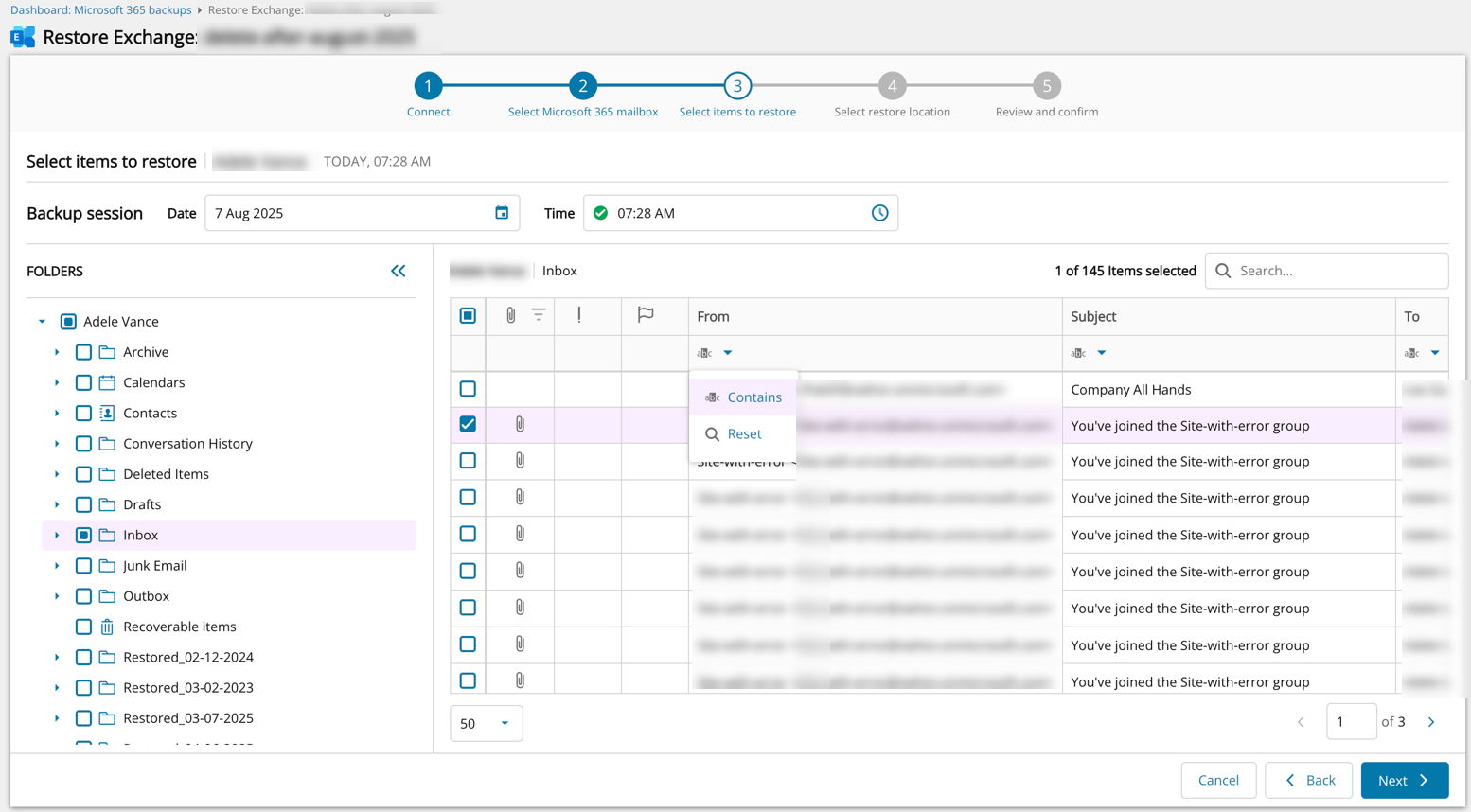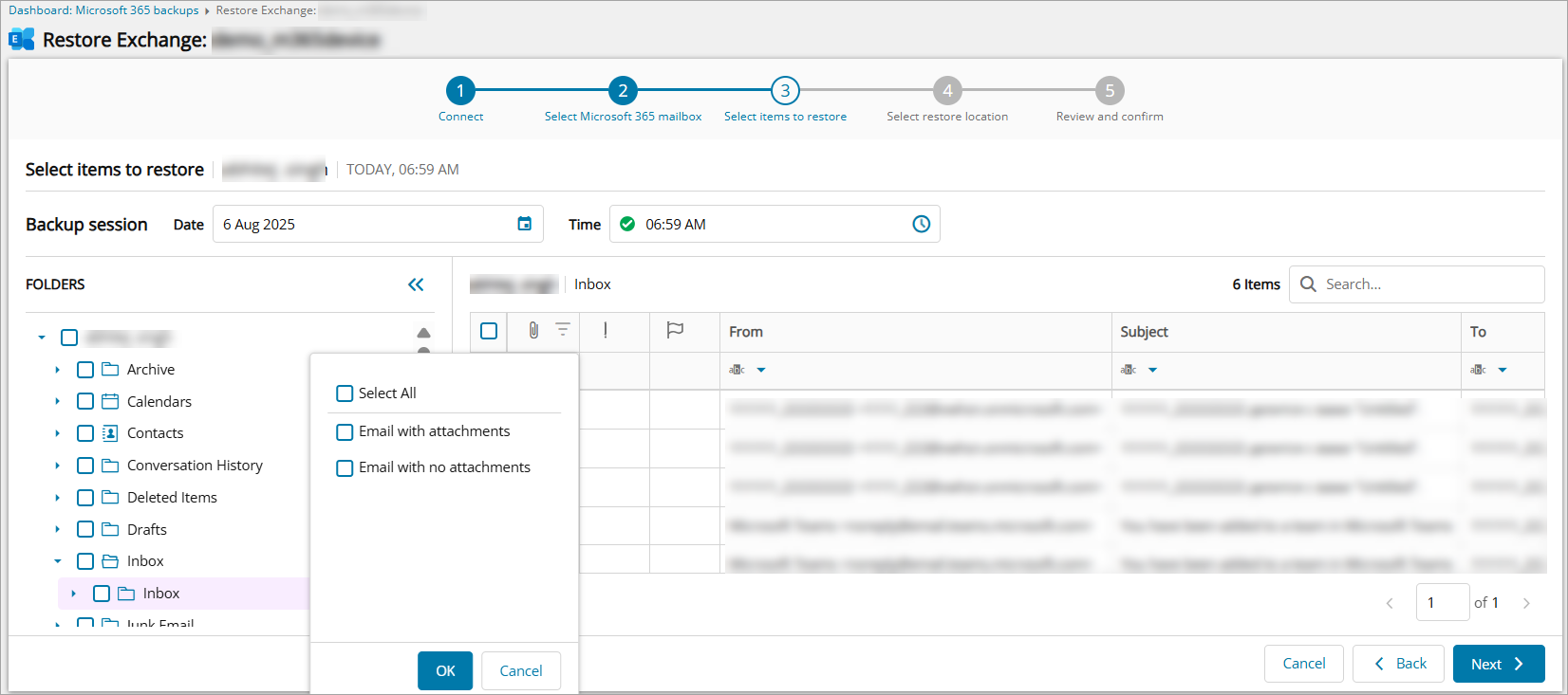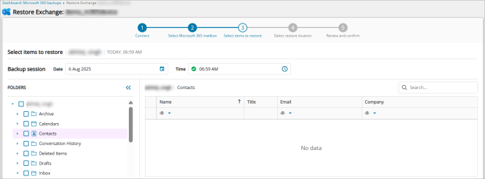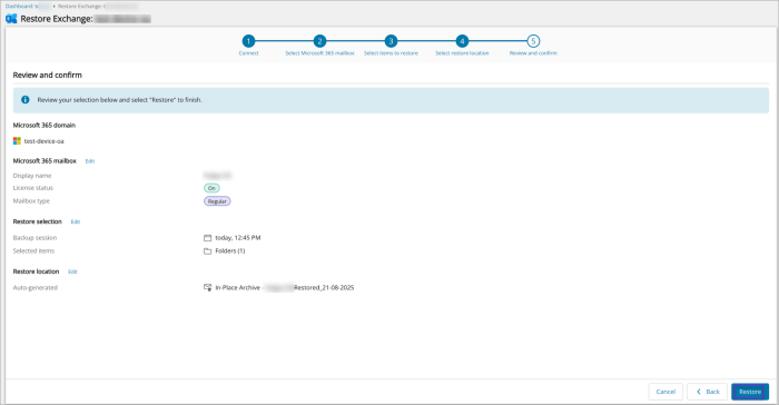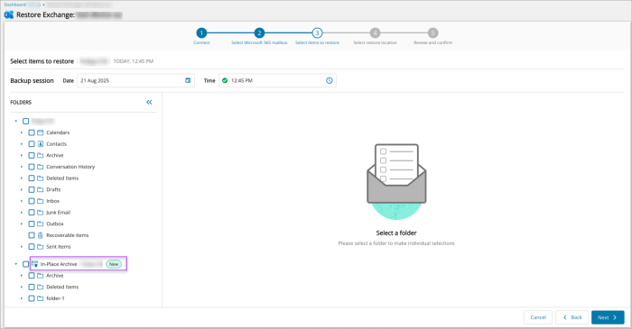 In-Place Archives data is available for restore within each Exchange restore session where In-Place Archives were backed up for selected mailbox (In-Place Archives backup has been enabled for the device and the user has In-Place Archive mailbox enabled).