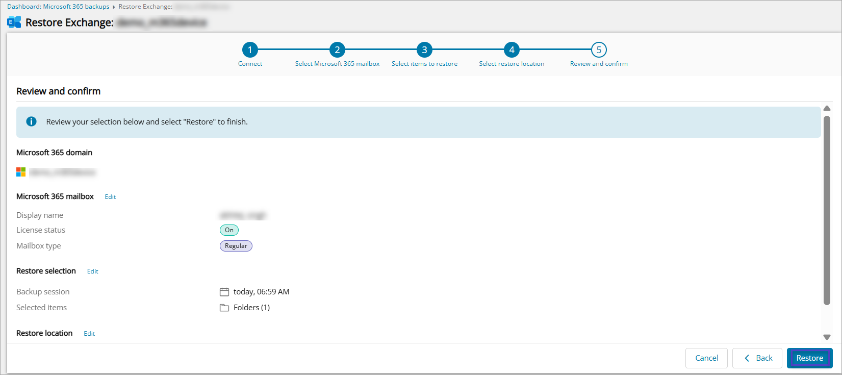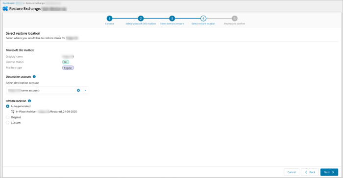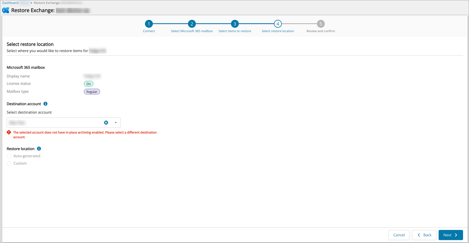 If the selected user does not have In-Place Archives enabled, the Restore location options will be disabled.