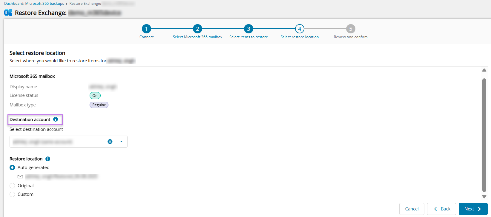 Exchange items from an active account can be restored to either the same account or another account. Exchange items from a deleted or unlicensed account can only be restored to another account.
