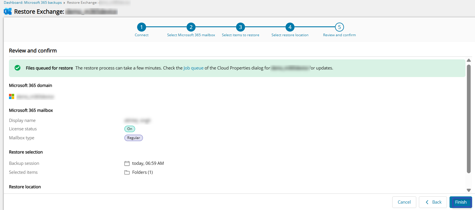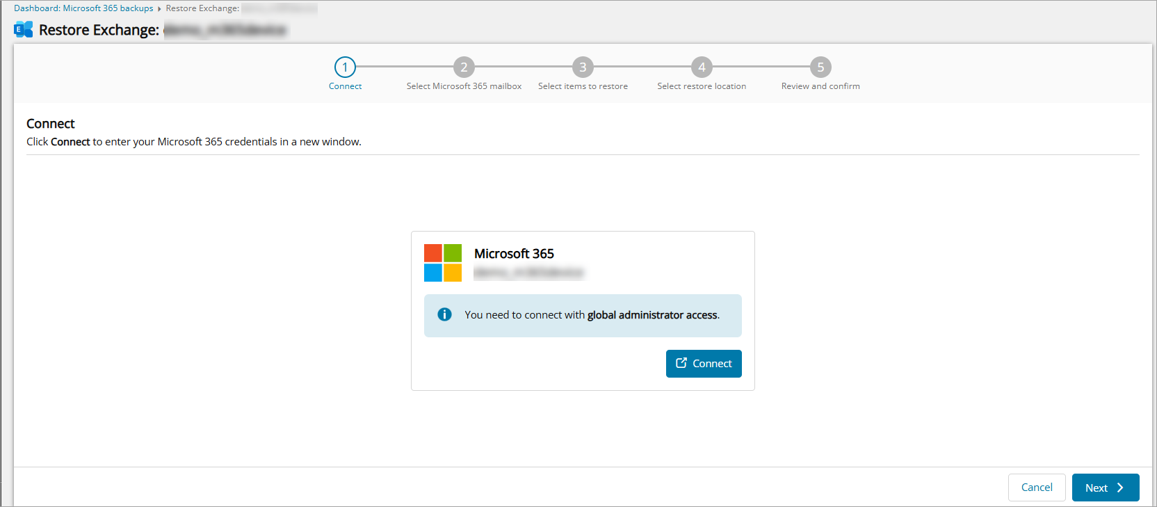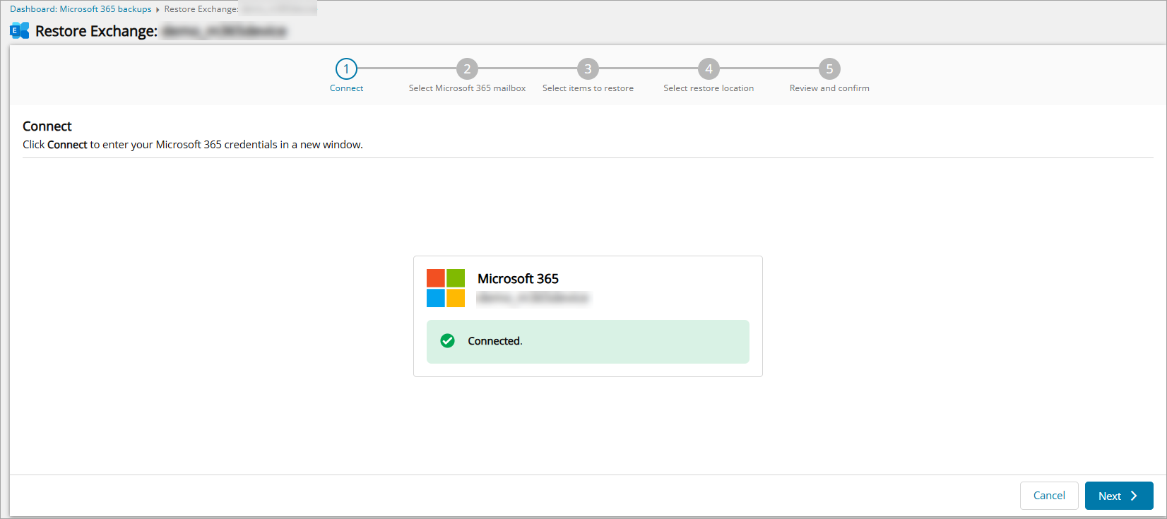 - You will receive a confirmation that the connection has been successful for the restore, click Next to proceed