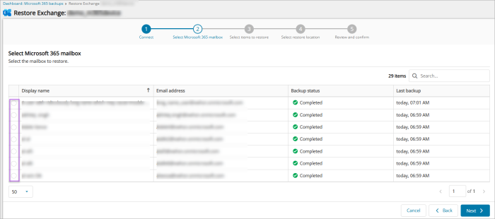 - Select the account you wish to restore items from and click Next. You will see the list of backed up accounts, backup status of the account, the account type (Active or Deleted), number of files and the size of the accounts selection.