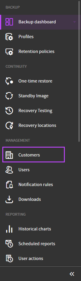 1. In the Management section of Management Console's vertical menu, click Customers to open the customer Management window or from Backup > Dashboard, select the customer dropdown at the top of the page