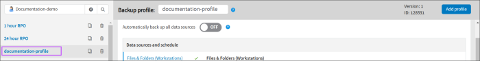 Cove Data Protection (Cove) has two default Backup Profiles (1 hour RPO and 24 hour RPO), which can be used by any Cove customer. However, it is also possible to create custom Profiles, which allow for custom configuration.