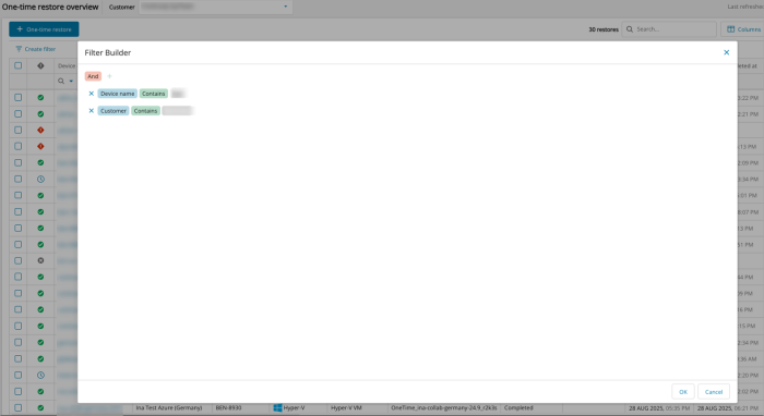 To create a custom filter, click Create Filter above the One time restore dashboard to open the Filter Builder