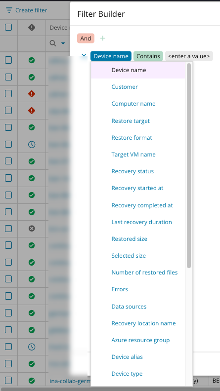 Searches can be layered, e.g. Device name contains 'ben' and Customer contains 'Germany'