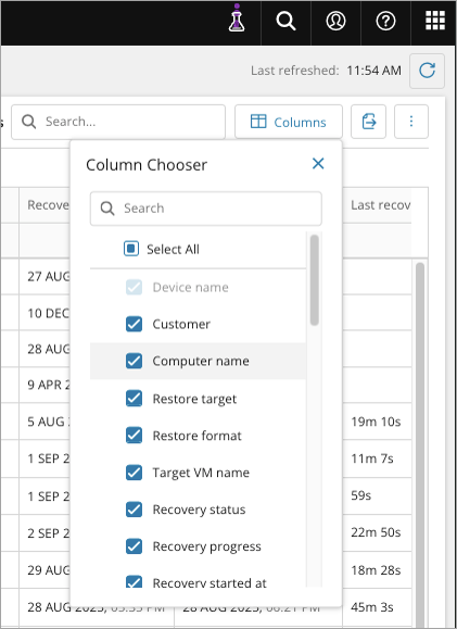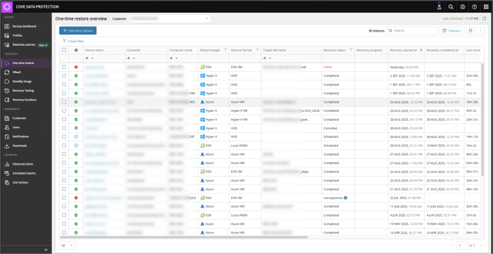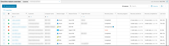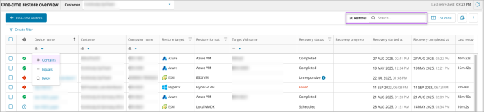 From this dashboard, you will see a specified set of columns detailing information relevant to devices using One-time Restore, including the status, restore format and data sources, along with other information relating to Hyper-V, Azure and VMWare ESXi.