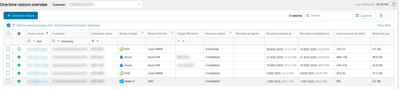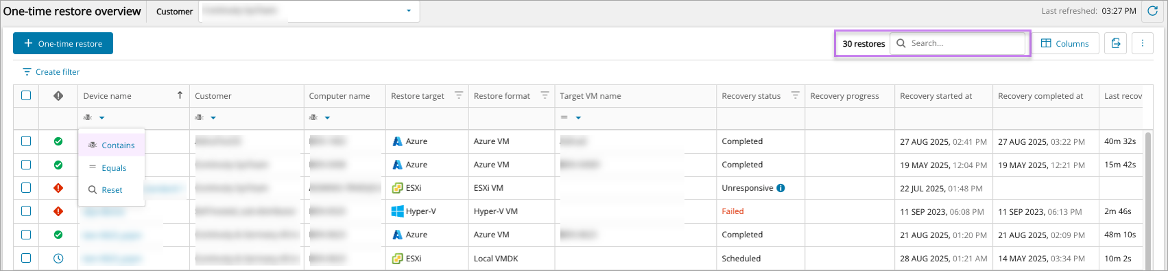 It is possible to filter the list of One time restore overview using filterable columns. Any column which is filterable is identified by the filter icon.