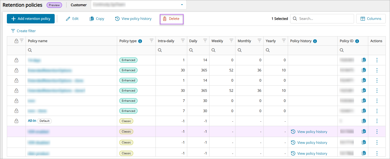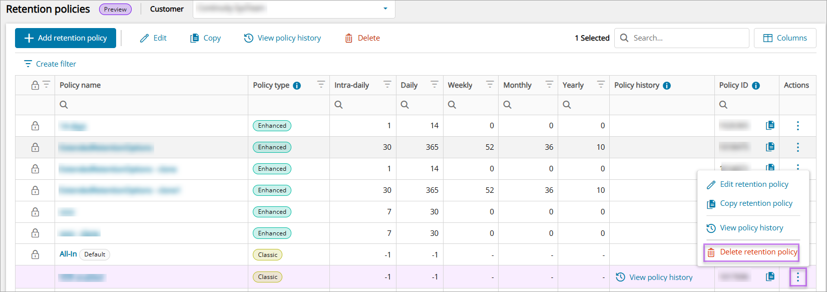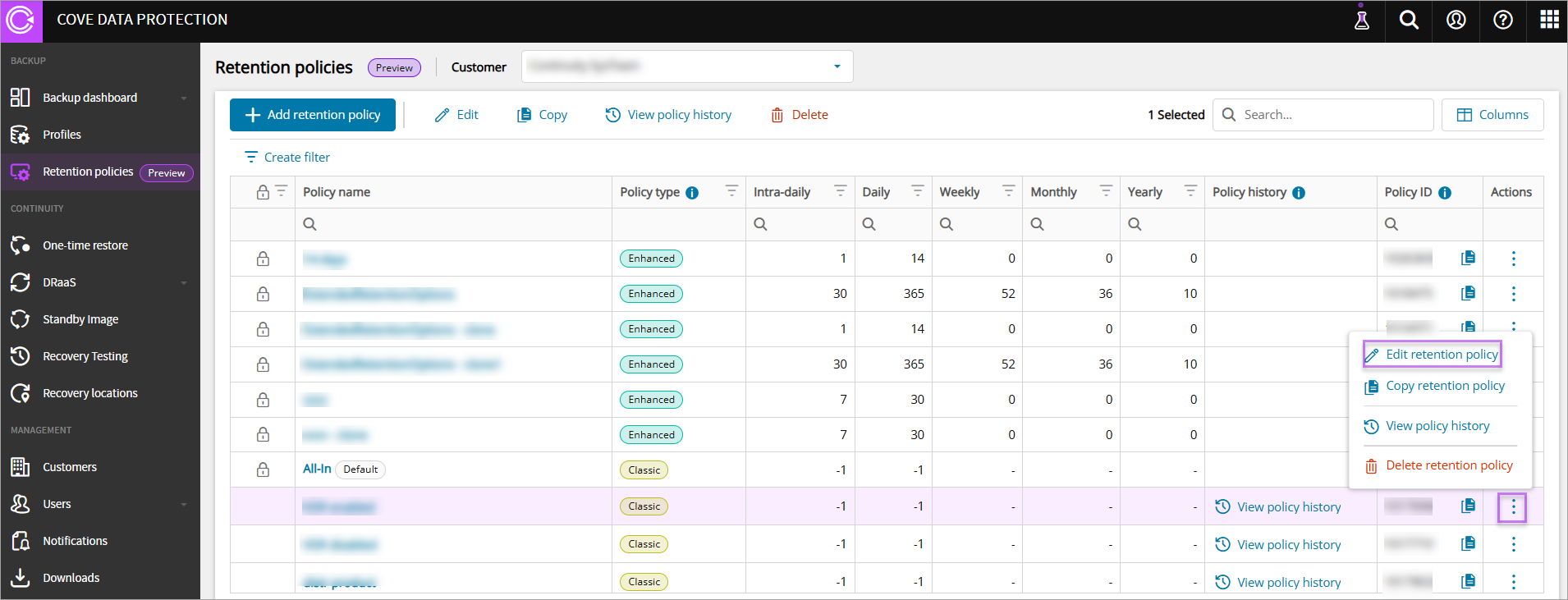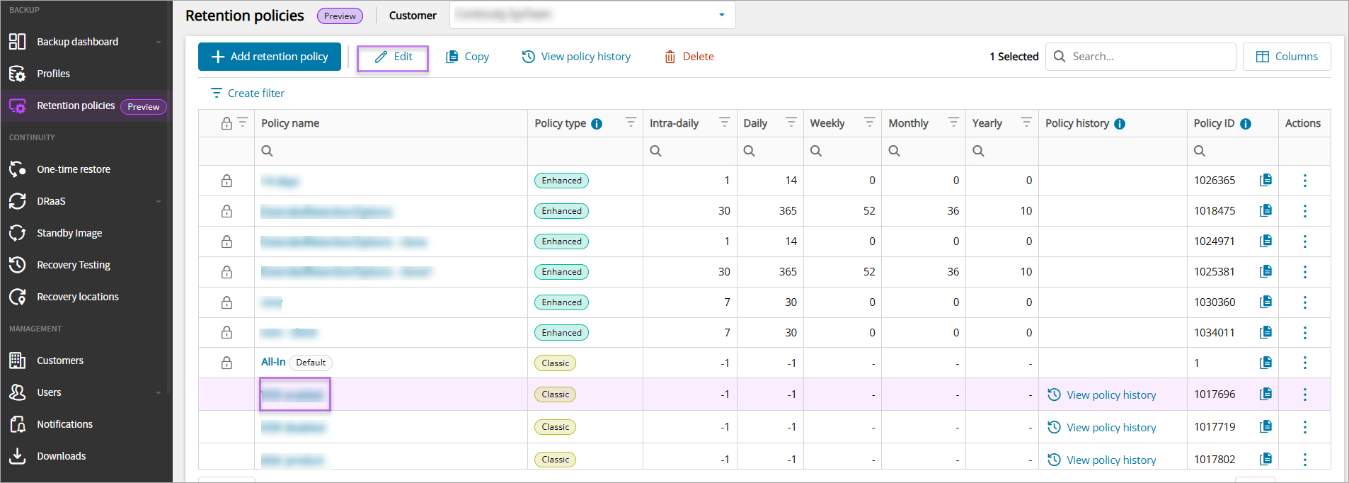 Management of existing retention policies allows you to edit, rename and delete those policies that are created at your customer level.