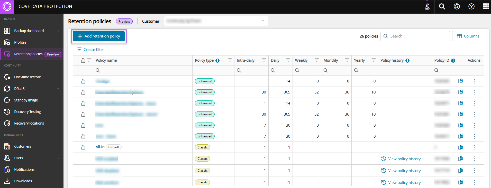 The Cove Data Protection (Cove) Retention Policies feature in the Management Console is a way of applying enhanced retention settings to your devices as an alternative to the classic Products feature used previously. This allows you to set and manage retention centrally, removing the need for Archiving schedules in the Backup Manager.