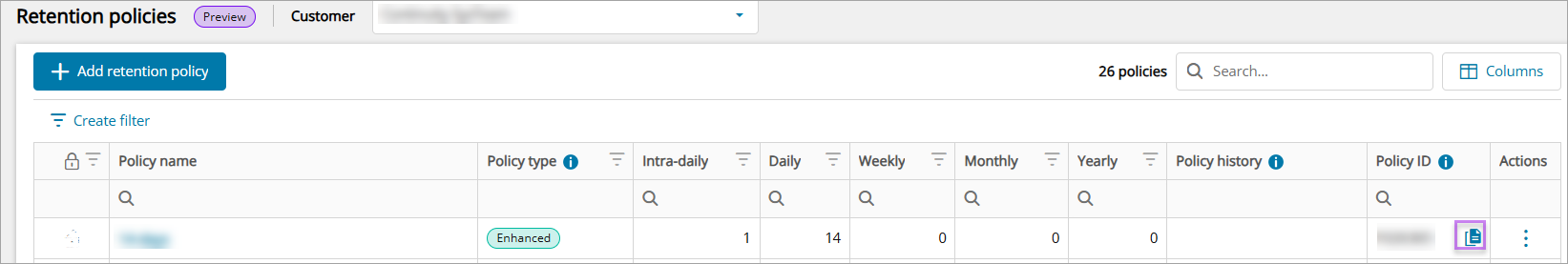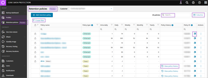 You can also View policy history, Search any policy, Create filter, select Columns to be displayed, and copy Policy ID.