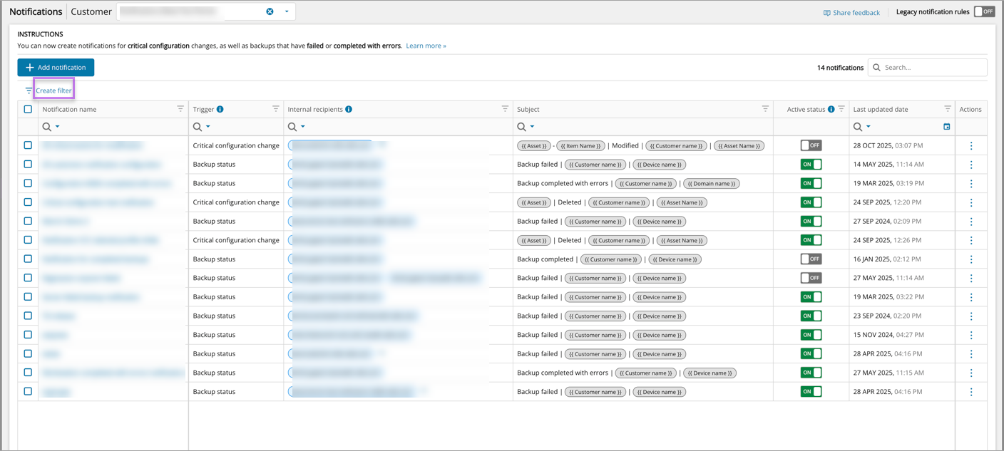 The list of Notifications in Cove Data Protection (Cove)'s Management Console can be searched and filtered accordingly, to fit required criteria.