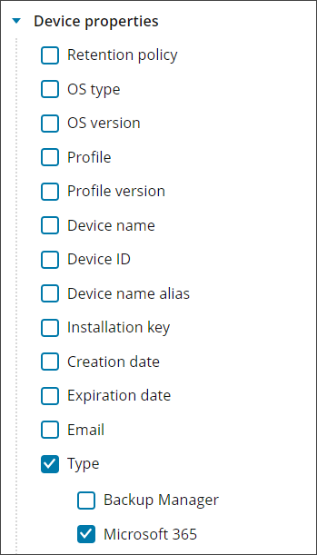 You can filter the displayed list by using the Filters on the left of the display, filtering on the Mailbox Type of Regular mailbox or Shared mailbox, User Status of Active or Deleted, Microsoft 365 license Licensed or Unlicensed and Backup Protected Users or Unprotected users.