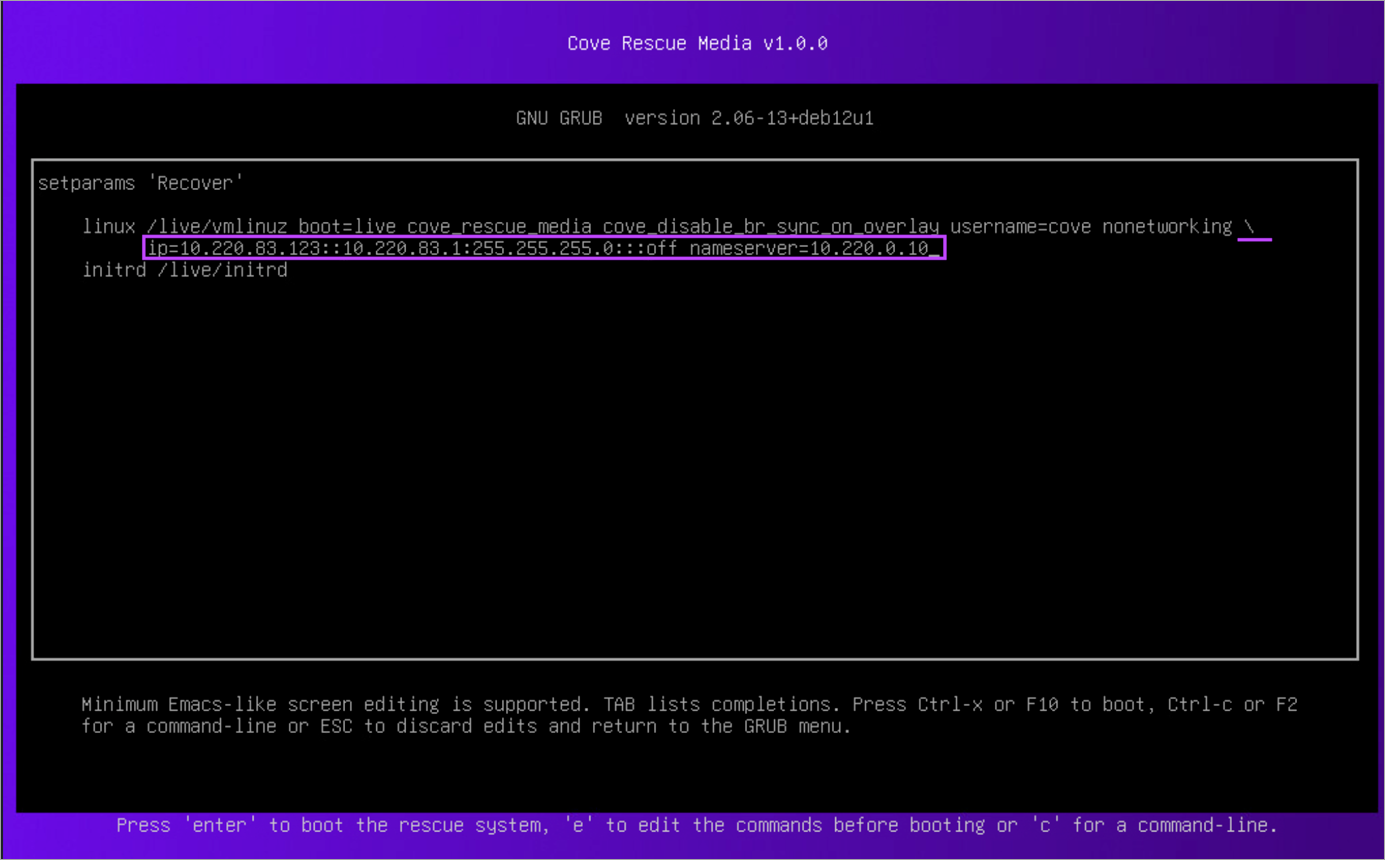 You can configure a static IP address for the Linux rescue system in two ways: