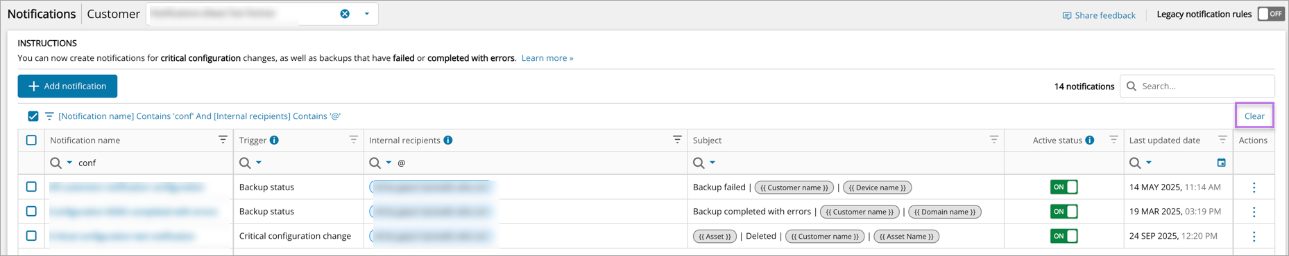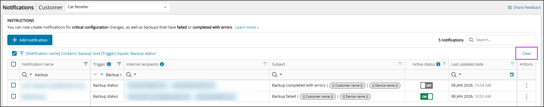 Filters can be cleared by clicking the Clear button at the top of the Notifications page, to the right of the filter string: