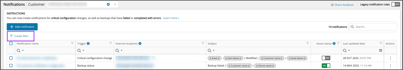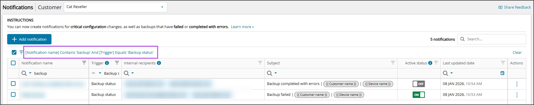 Searches can be layered, e.g. Notification Name contains 'backup' and Trigger equals 'Backup status'. Once the filter is created, this will appear above the updated list similar to:[Notification Name] Contains 'backup' And [Trigger] Equals 'Backup status'
