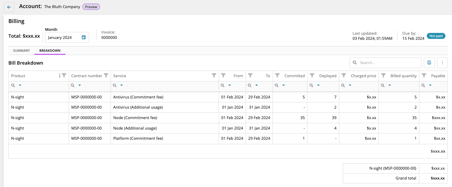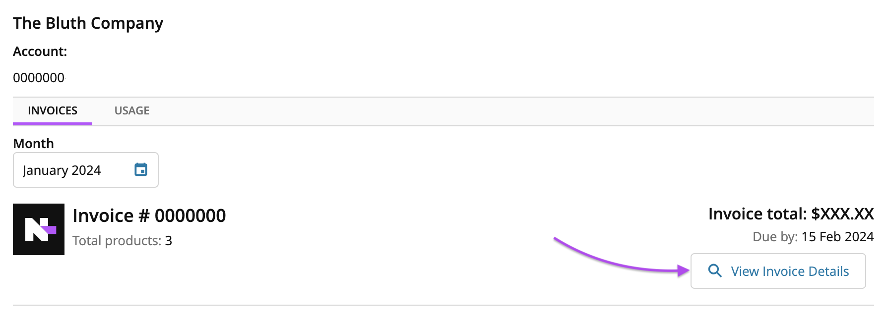Or from the Usage page, click the Billing tab at the top of the page to view a breakdown of current N-sight invoices, or to look back at a past invoice. View the last bill received, current bill due date and whether it has been paid or not.