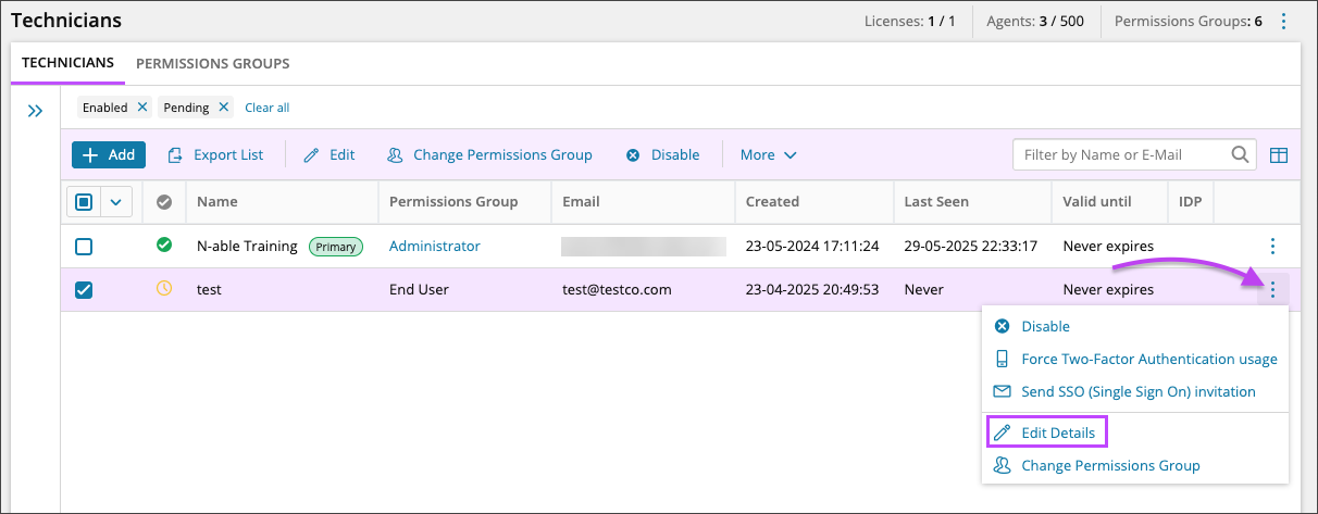 - Click Add technician to save the new End User and send them an SSO (Single Sign On) invitation email with instructions on how to Create a N-able Login Account and log in to the End User Area.